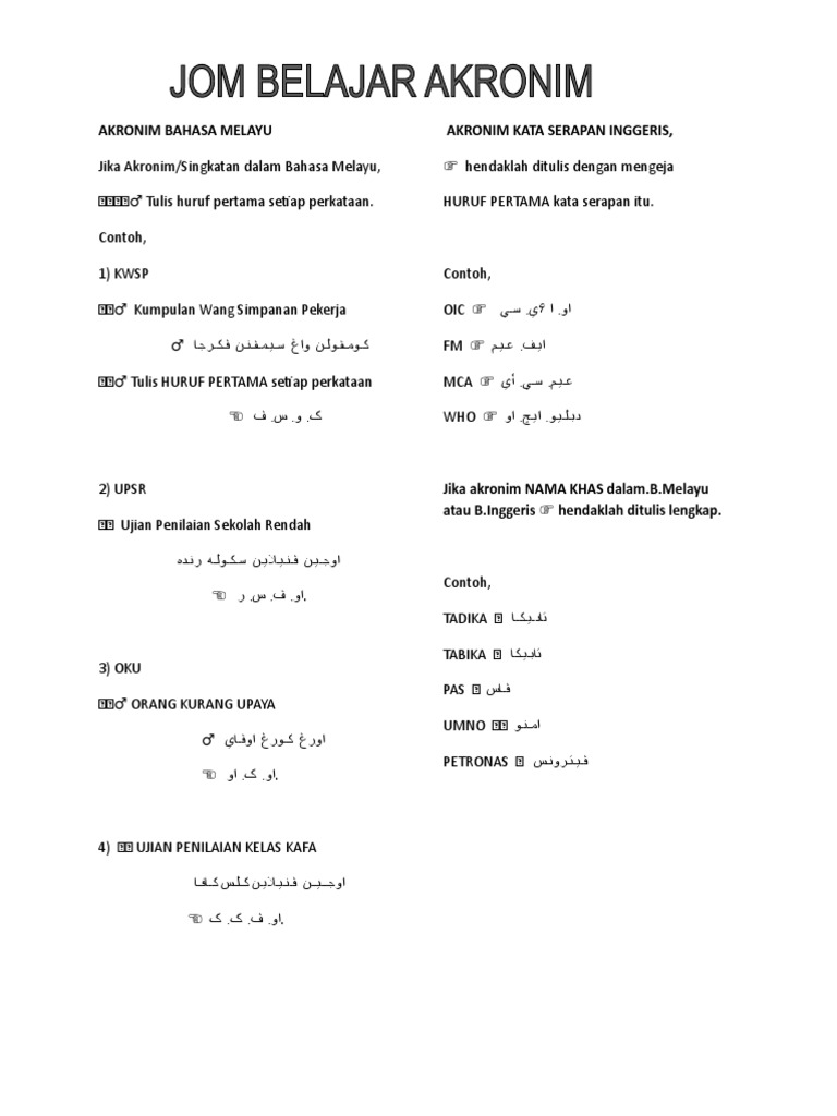 . Semoga perkongsian informasi maklumat makluman pemberitahuan laman web sesawang pautan portal rasmi panduan bahan-bahan rujukan bahan-bahan pembelajaran dan pengajaran sumber-sumber rujukan dalam post di blog Bumi Gemilang berguna dan dapat. Daripada contoh- contoh di atas jelas kelihatan bahawa cara pembentukan kata akronim sebagai satu proses pemendekan dan penggabungan untuk membentuk kata mempunyai potensi dalam bahasa Melayu. Nota-Nota Tatabahasa dan Kesalahan Tatabahasa Bahasa Melayu K.